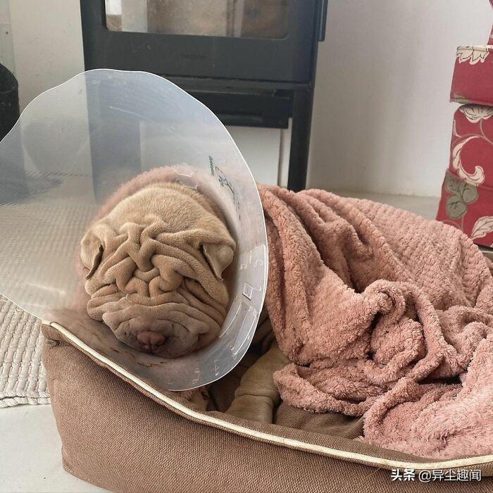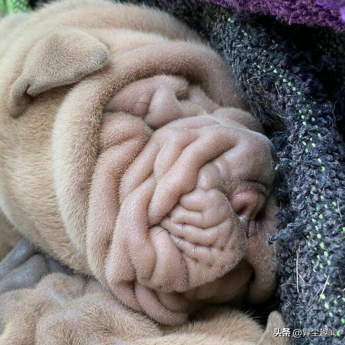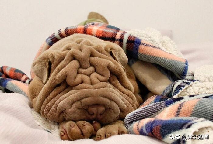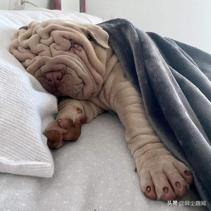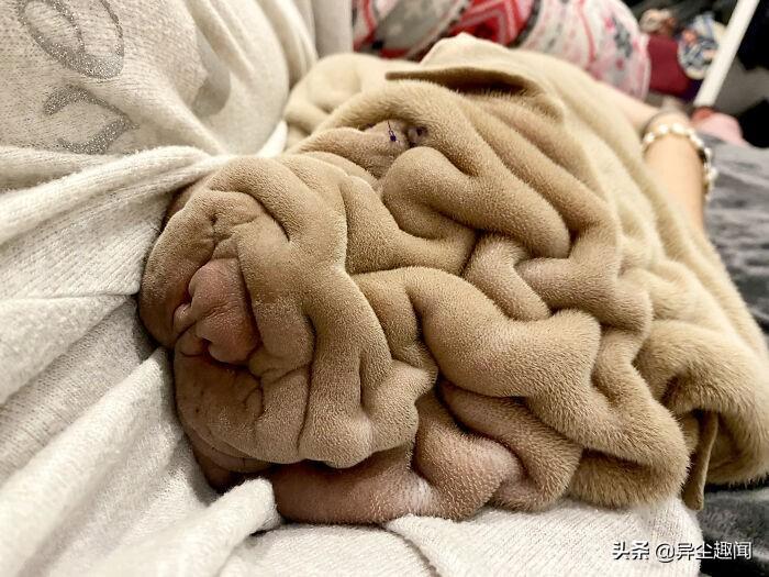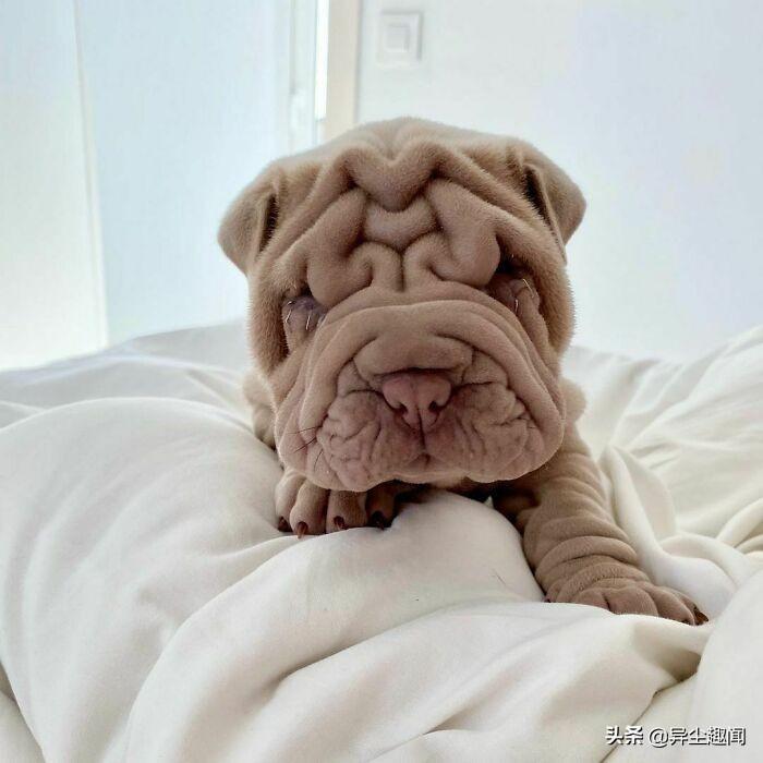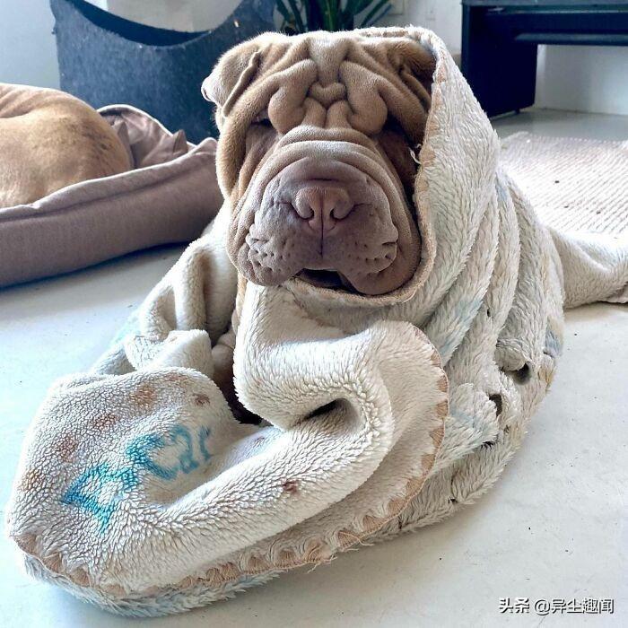 图片上的毯子实际上是一条狗。在这个令人难以置信的逼真幻觉的背后,是一个可爱的六个月大的沙皮犬哈维,它以其独特的外貌赢得了互联网的广泛赞誉。人们开玩笑地说,它看起来比其它狗更像毛巾或地毯。他22岁的主人特蕾莎·莫尔说它深而柔软的皱纹使它非常适合拥抱。
