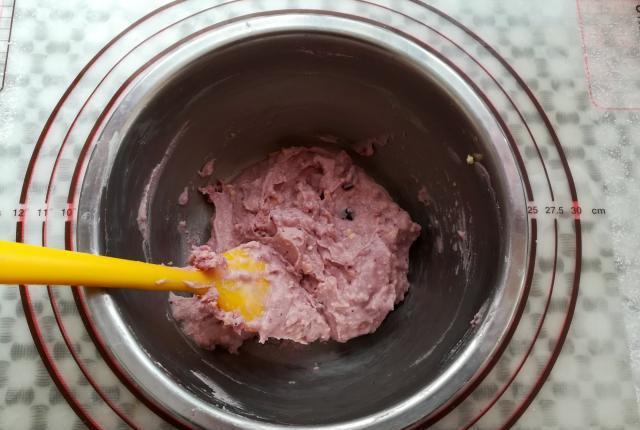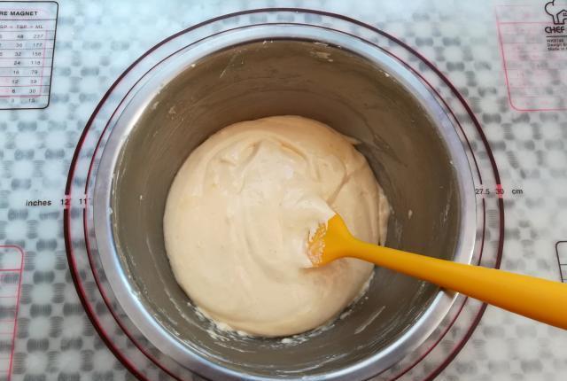 用硅胶刮刀把蛋糊和面粉混合到没有干粉状态,混合时候的动作要轻柔,防止蛋糊消泡。这个时候去预热烤箱,上下火160度5分钟。