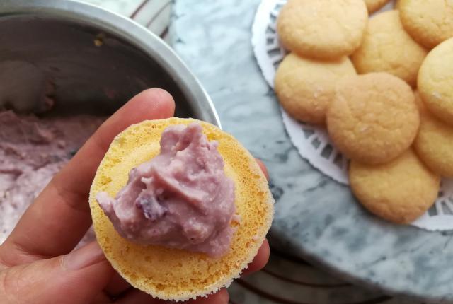 用小勺子取适量的蓝莓酸奶夹心放到小蛋糕上,再取一个蛋糕盖上,夹心馅的老式鸡蛋糕就做好了。小蛋糕这种做法最好吃,不加牛奶不加油,吃出小时候的味道。