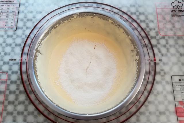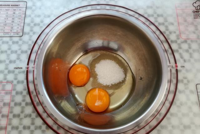鸡蛋去壳,跟白砂糖A一起放入无水无油的盆子里。这个老式鸡蛋糕是不需要加牛奶和油的。
