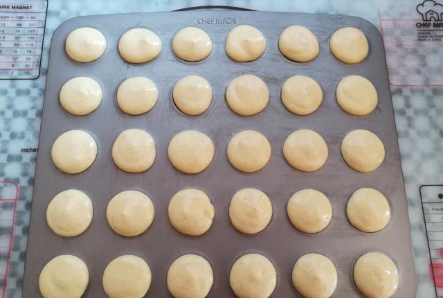 鸡蛋糕面糊装入裱花袋里,在烤盘里挤出合适的大小,如果没有这种固定直径的烤盘,可以直接挤在垫了油纸的任意烤盘里。
