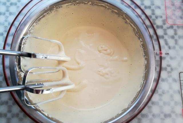 用电动打蛋器打发到提起打蛋头蛋糊滴落在盆子里,花纹不会很快消失的样子。