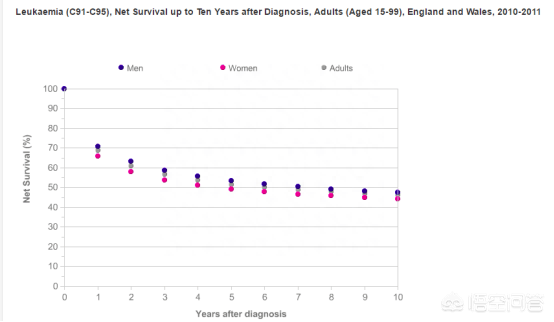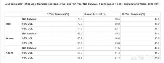 比如,英国癌症研究机构给出英格兰和威尔士成年人白血病1、5、10年存活率数据如下: