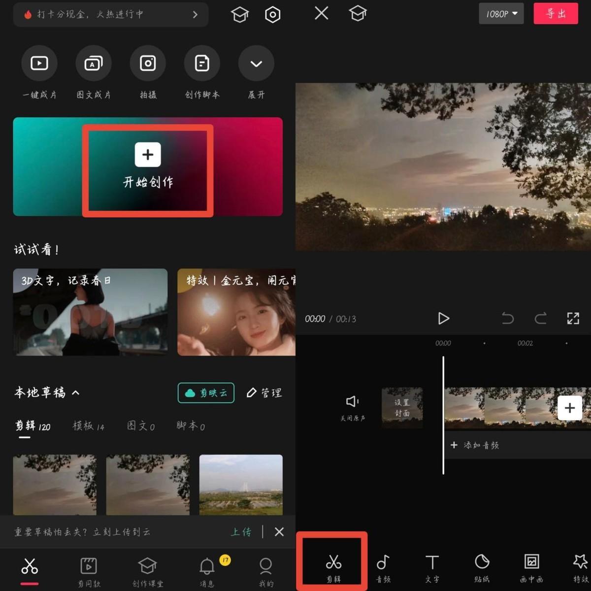 打开app,在首页的【+开始创作】选择视频导入,在跳转的页面点击底部工具栏中的“剪辑”选项下的“音频分离”,分离成功后即可提取出该视频的音频原声。