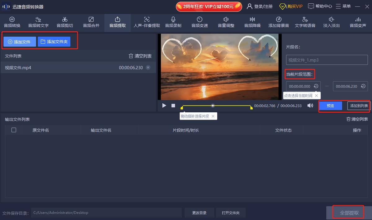 支持20多种主流视频格式,能批量导入提取音频,可自由设置需提取音频的片段范围,通过实时播放预览窗口即可轻松找到目标位置。