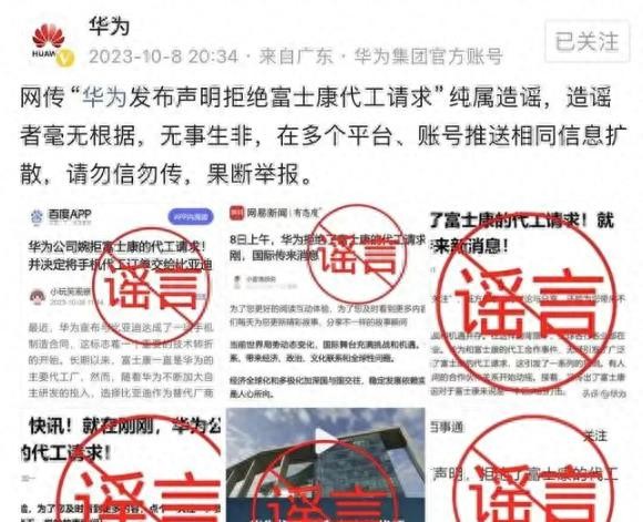 可见华为手机对于富士康来说非常重要。然而,虽然华为和富士康合作紧密,但并没有华为拒绝富士康代工请求的情况。这一消息的流传纯属谣言,造谣者毫无根据,甚至在多个平台、账号上推送相同信息扩散。我们应该果断举报这类虚假消息,不要相信,更不要传播。作为用户,我们应该保持对于信息的敏感性和辨别能力。在互联网时代,谣言和假新闻层出不穷,我们要学会用批判的眼光看待信息,不被虚假信息所蒙蔽。同时,我们应该通过正规渠道获取信息,如华为官方声明等,避免受到不实消息的影响。