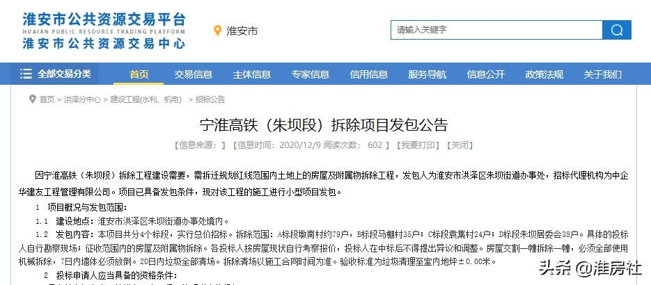 除上述5个区域即将拆迁外,12月9日宁淮高铁朱坝段也发布了拆除项目发包公告,将对墩南村79户、马棚村35户、段袁村24户以及朱坝居委会38户总计176户实施拆迁。