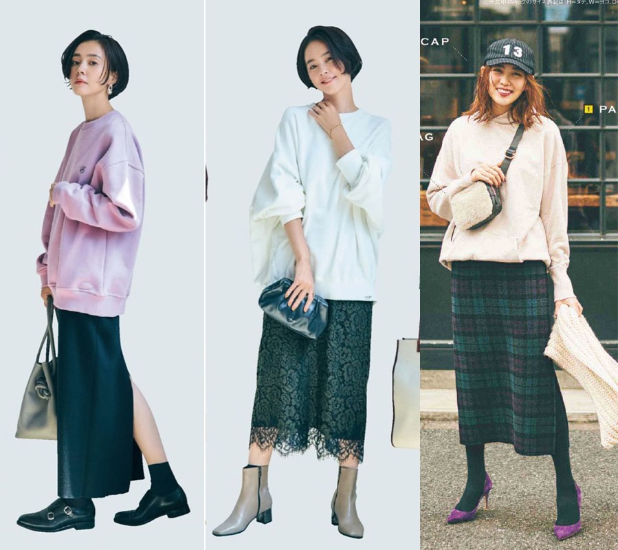 宽松的卫衣更适合搭配裙摆比较窄的修身直筒半裙。想要更时髦有型,可以搭配柔软的丝绸材质的直筒开衩长裙,又或者选择精致的蕾丝直筒裙,将娘man平衡风演绎得更极致。