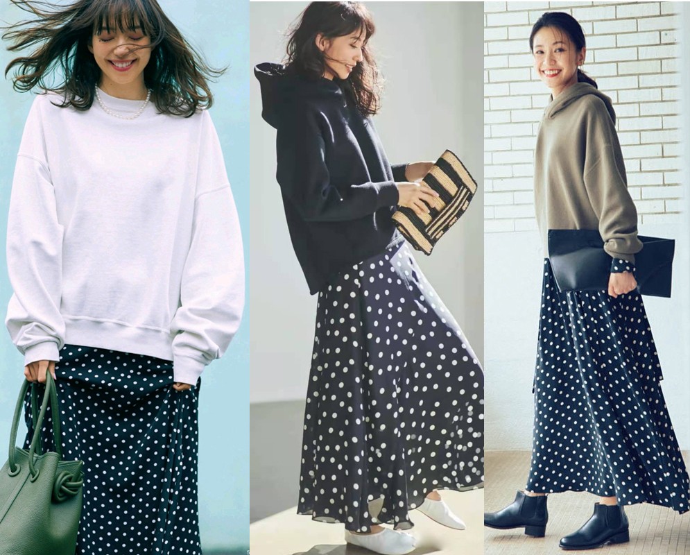 白色圆领卫衣,简洁明亮,在春天穿非常提气色。选择宽松的落肩款式,有一种慵懒松弛的气质,让人看起来有一种娇小感,看上去反而更显瘦。裙子的搭配请选择经典的黑白、蓝白小波点半裙,复古之余又带着俏皮与灵动,很有女人味。这个搭配思路也很适合中年女性,时髦优雅又很减龄。