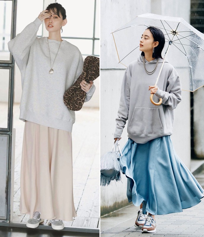 灰色系的圆领卫衣,素雅的色调非常百搭显气质,选择宽松的款式其实更显遮肉显瘦,自由舒适的松弛度,感觉很中性化,搭配质感柔软的缎面半身长裙可以增加温柔女人味,裙子的颜色可以选择相近的淡雅色系,或者用浅蓝色缎面裙搭配灰色连帽卫衣也是值得借鉴的组合,总之色彩搭配不要太跳跃,保持简约才是最美的。