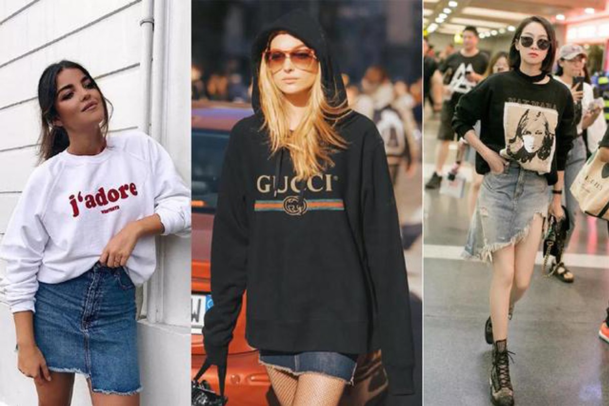 卫衣搭配短裙,整体感觉非常减龄,富有活力。采用这种穿法的时候,最好选择更有街头休闲风格的字母款卫衣或者印有图案的圆领卫衣,带有一点酷酷的帅气,搭配牛仔短裙简直绝配。小个子女生选择卫衣搭配短裙的话,记得要露出腰线。