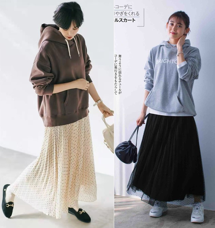 轻盈之中带点梦幻的薄纱长裙,最契合浪漫的春季氛围,轻柔的薄纱裙搭配宽松的连帽卫衣,可以化解卫衣的粗糙和厚重感,让整体穿搭的风格达到平衡。