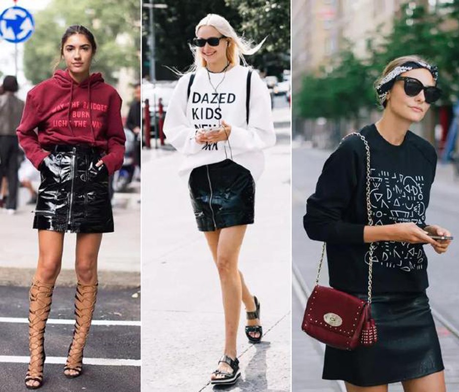 除了牛仔短裙,还有更时髦的皮革材质的短裙,用来搭配字母款、图案款的卫衣,多了一种帅气的摇滚味道,华丽的皮短裙和卫衣的休闲感形成很有趣的对比,整体穿搭既有街头风又很有高级感,减龄效果也是满分。