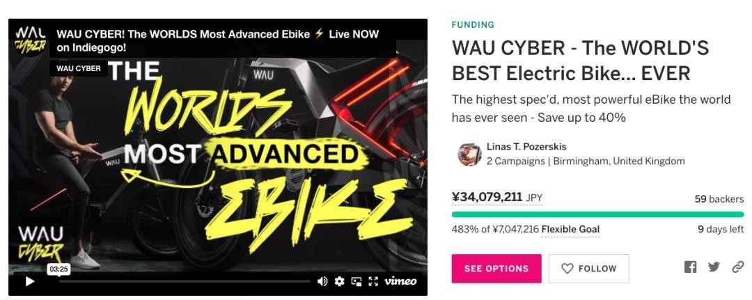 这款号称世界上规格最高、动力最强的电动自行车 WAU Cyber ,7月的时候发起众筹,不到一天就突破了100万人民币,成绩可以说是非常亮眼了。