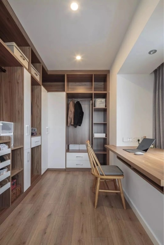 衣帽间整体简约利落,利用飘窗改造成的小书桌更是小巧别致。
