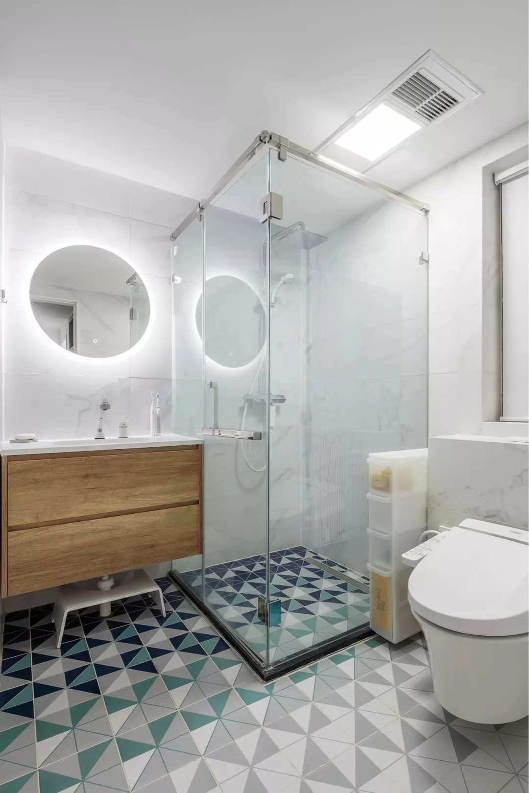 如果条件允许的话可以在洗漱台上下安装两个储物柜,以方便放置一些洗漱用品,增加整个卫生间的美观性。