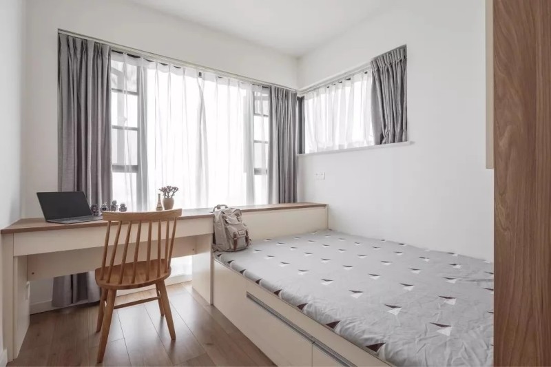 主卧设计的非常有特点,木质床头一体柜+飘窗,结合纯白百叶窗和灰蓝墙面,一种岁月静好的舒适感让人心神愉快。