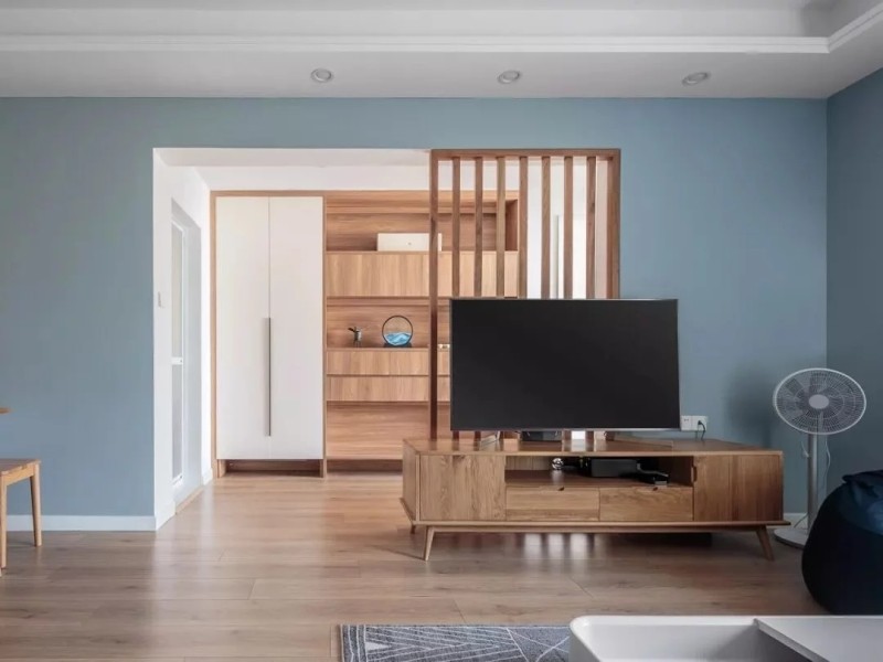 电视墙打掉一半换成木框屏风,后面打上一排收纳柜,敞亮通透。