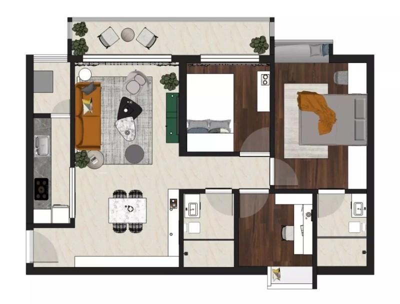 利用灰蓝色和温润的木地板铺满整个客餐厅空间,家具也选用最简单轻盈的风格,搭配一盆雅致的绿植盆栽,舒服。