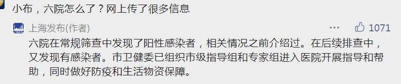 面对网友的提问,上海市人民政府办公厅官方微信“上海发布”多次进行了回应。最新消息是:上海市卫健委已组织市级指导组和专家组进入医院开展指导和帮助,同时做好防疫和生活物资保障。