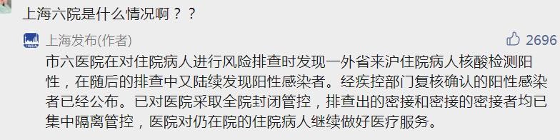 11日,有网友提问“上海六院是什么情况啊??”,上海发布回应称:市六医院在对住院病人进行风险排查时发现一外省来沪住院病人核酸检测阳性,在随后的排查中又陆续发现阳性感染者。经疾控部门复核确认的阳性感染者已经公布。已对医院采取全院封闭管控,排查出的密接和密接的密接者均已集中隔离管控,医院对仍在院的住院病人继续做好医疗服务。