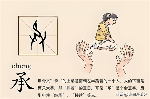上面是一个人,下面是一双手,意思是用手将一个人捧起来,所以段玉裁说:“承者,奉也,受也。”