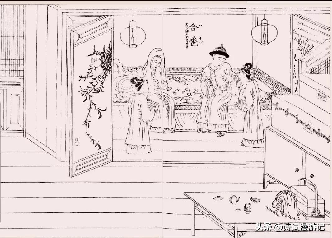 房中灯笼高悬,箱笼重叠(想必是新娘带来的嫁妆)。新郎神情腼腆,新娘更是娇羞,接下来就要双双饮“交杯酒”了。