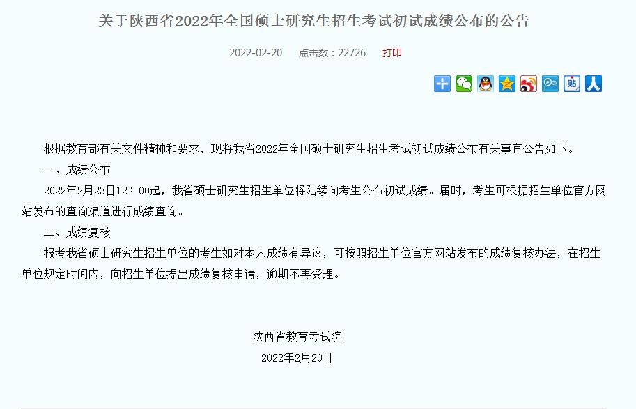 2022年2月23日12:00起,陕西省硕士研究生招生单位将陆续向考生公布初试成绩。届时,考生可根据招生单位官方网站发布的查询渠道进行成绩查询。