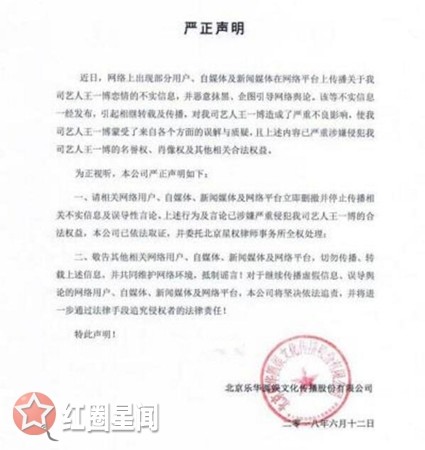 因为王一博和綦美合一起吃鸡被曝光,王一博工作室不得不再次出面澄清绯闻,转发之前经纪公司的声明,否认王一博和綦美合恋情。