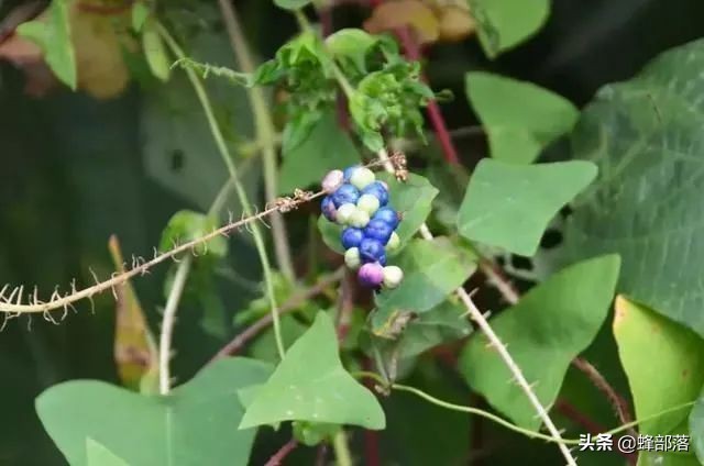 河百草的叶片呈三角形,长宽长不多,但是顶端是尖的也有钝圆的,就像是爱心一样。叶片不厚,像纸片一样薄;叶片正面光滑没有毛,但背面和藤一样都长了倒皮刺。叶柄长与叶片差不多,而且也带有倒生的皮刺。生长在各分枝交界处的托叶穿过枝生长,大小和正常叶片一样。