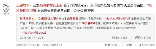 6月16日,王思聪参加超级红人节活动,专访视频竟被网友吐槽丑,王思聪转发回应:“看了你的照片后,我不知你是如何有勇气说出这句话的。”