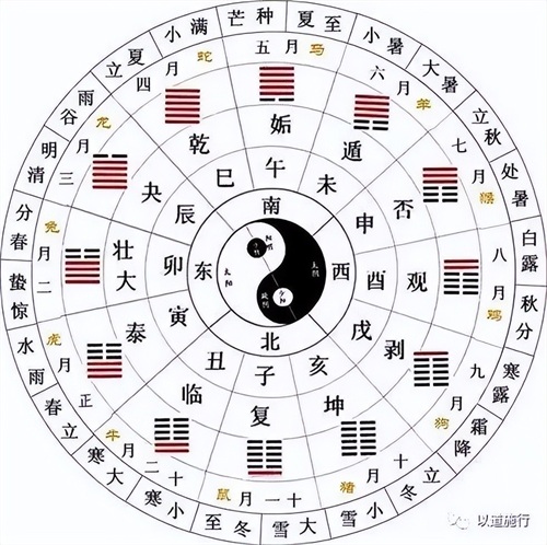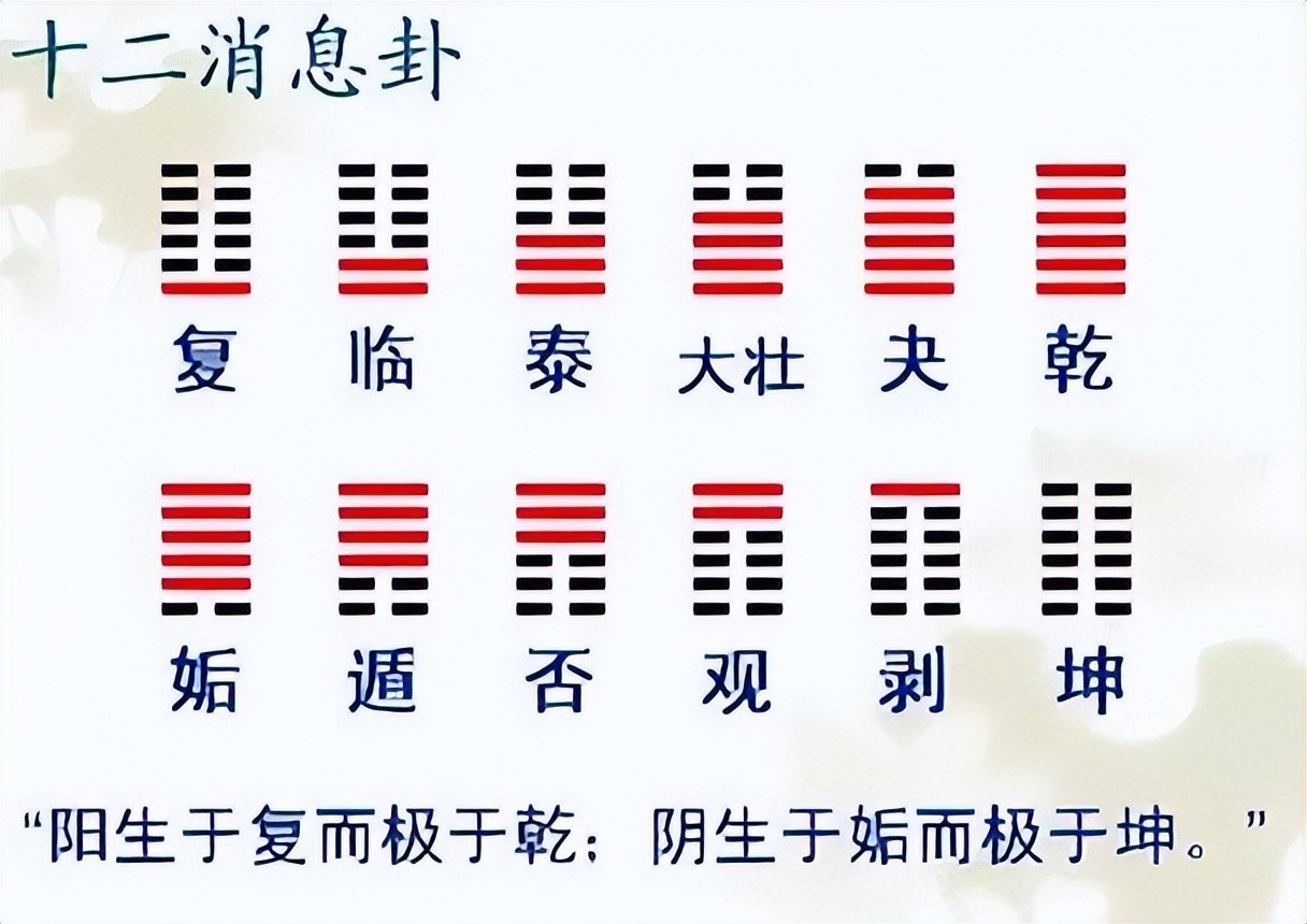 十二消息卦也称十二辟卦,包括:复、临、泰、大壮、夬、乾、姤、 遯、否、观、剥、坤。直观看,这十二个卦的阴阳爻都是一伙一伙的,阵营分明。表面看阳爻进而阴爻退有六卦:复、临、泰、大壮、夬、乾;阴爻进而阳爻退有六卦:姤、 遯、否、观、剥、坤。