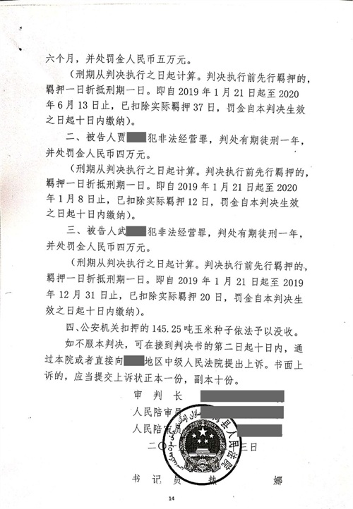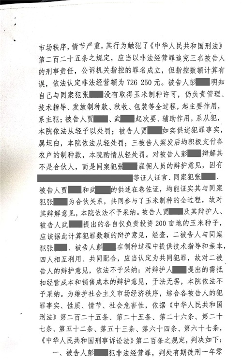 法院经审理认定,侵权人的违法犯罪行为严重扰乱了种子生产经营的市场秩序,情节严重,构成非法经营罪,依法追究刑事责任。三名侵权人分别被判处有期徒刑。人民法院依法判处彭某有期徒刑一年零六个月,并处罚金人民币五万元;判处贾某有期徒刑一年,并处罚金人民币四万元;判处武某有期徒刑一年,并处罚金人民币四万元;涉案扣押玉米种子依法予以没收。