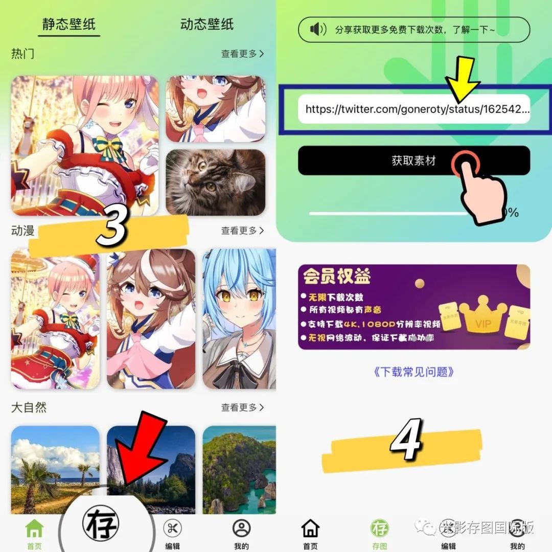 打开光影存图app点下方的“存图”,把刚刚的链接复制到白色的框框里,点“获取素材”