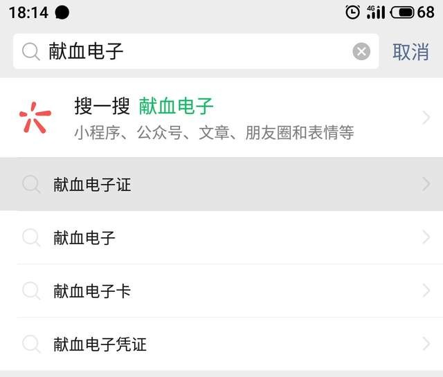 1. 登录手机微信,在右上角点击搜索图标,在输入框里输入:献血电子