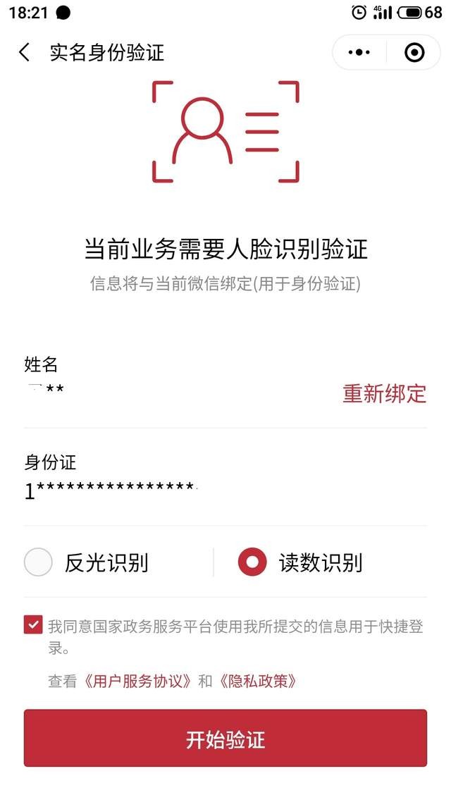 3、输入身份证号和姓名,进行身份校验