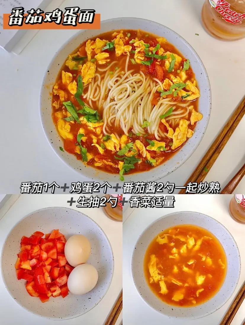 6️⃣番茄鸡蛋面:番茄1个➕鸡蛋2个➕番茄酱2勺一起炒熟➕生抽2勺➕香菜适量。