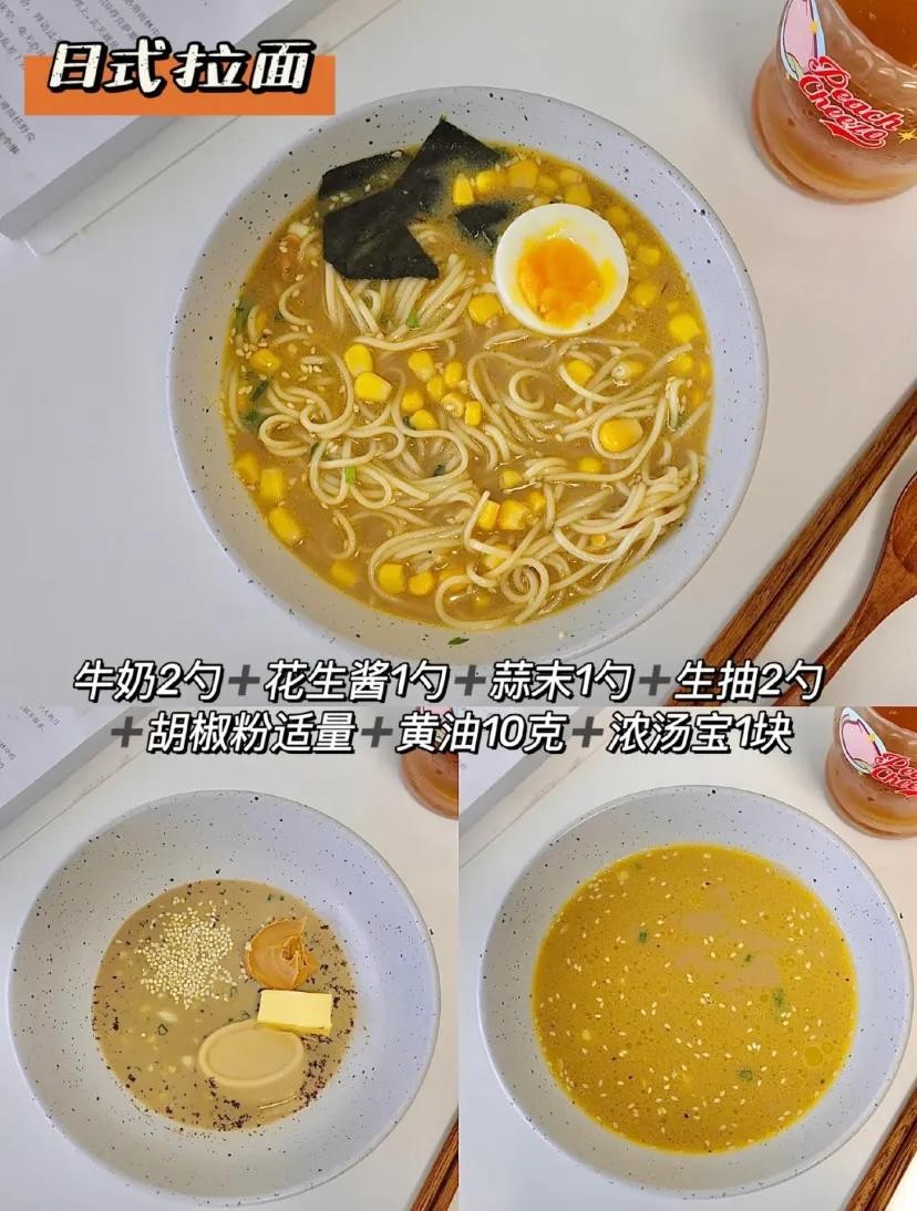 3️⃣日式拉面:牛奶2勺➕芝麻酱1勺➕蒜末1勺➕生抽2勺➕胡椒粉适量➕黄油10克➕浓汤宝1块。