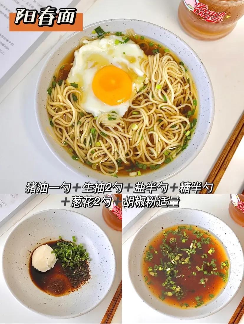 5️⃣阳春面:猪油1勺➕生抽2勺➕盐半勺➕糖半勺➕葱花2勺➕胡椒粉适量。