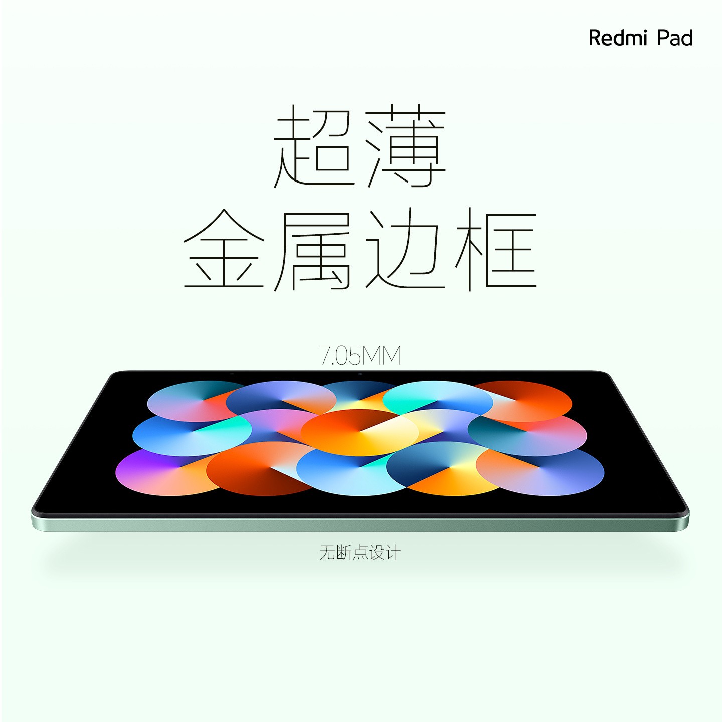小米 Redmi Pad 拥有深灰色、银色、烟青绿 3 款配色,厚 7.05mm,重 445g,采用 Unibody 一体化全金属机身。