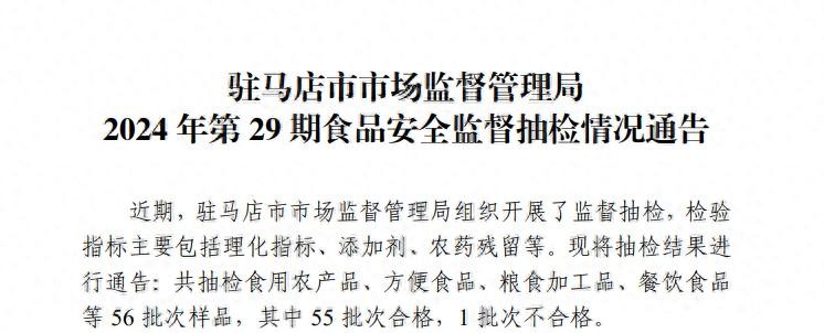 近期,驻马店市市场监督管理局组织开展了监督抽检,检验 指标主要包括理化指标、添加剂、农药残留等。现将抽检结果进 行通告:共抽检食用农产品、方便食品、粮食加工品、餐饮食品等56批次样品,其中55批次合格,1批次不合格。