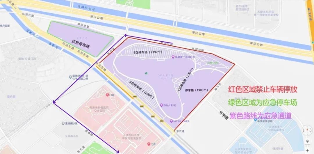SM天津滨海城市广场共配置有停车位5795个,其中A区1200个、B区2392个、C区220个、停车楼1层510个、停车楼2层230个、停车楼三层1243个。针对永辉超市恢复营业后停车需求增加的情况,当上述商场内部停车场接近饱和时,驾驶人需遵守交警和商场工作人员引导,在周边临时停车位置单排顺行停放车辆。需要注意的是,环河北路—东四道—桂雨路—东六道-空港总医院沿线为车辆应急通道,禁止社会车辆停放。