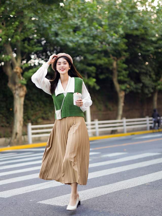 她还挑了一件百褶裙,百褶裙是每个年龄段都能搭配的,不过百褶裙也不是那么容易挑的,白不能抗污,有些色彩比较清爽,还有几种比较偏深,但是百褶裙确实是秋季最流行的搭配。