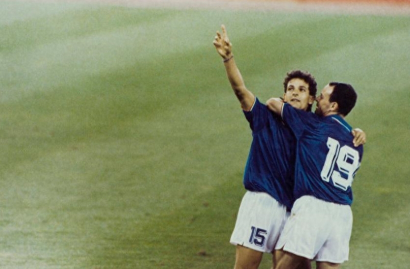 1990年意大利世界杯赛,巴乔承载了所有意大利人的希望。他和斯基拉奇带领球队一路披荆斩棘,可惜半决赛点球输给了马拉多纳的阿根廷队,从此开启了意大利队16年点球不胜的魔咒。不过在3,4名决赛中,巴乔和斯基拉奇再次进球帮助意大利战胜了英格兰队。