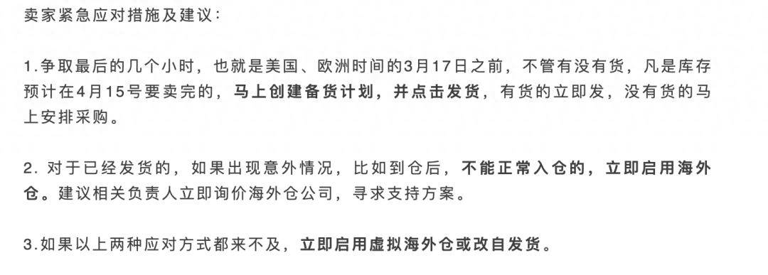 有业内人士做出了3条卖家紧急应对措施,在时间够用的情况下,创建备货计划和立即启用海外仓。