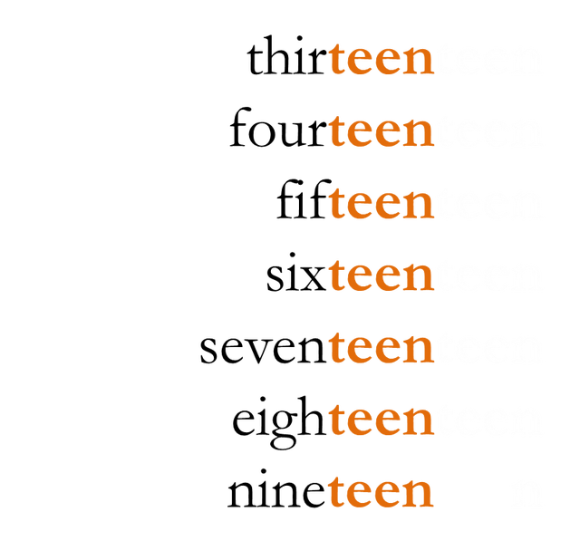 今天,关于金融行业的报刊文章说中,经常使用In the high/low teens的说法,来表示数字范围,这种用法也是来源于从13到19这七个带-teen的数字。
