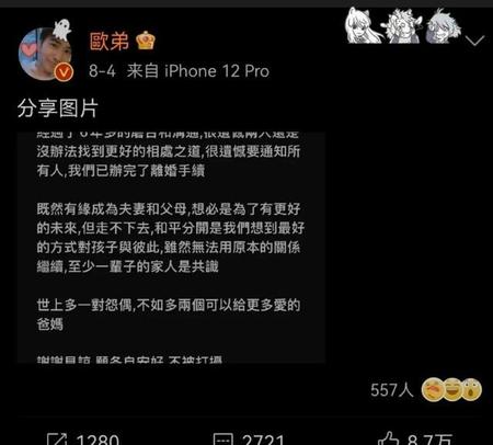 8月4日凌晨,欧弟发文表示“我们已经办理好离婚手续了,和平分开是我们想到最好的方式对孩子和彼此”。