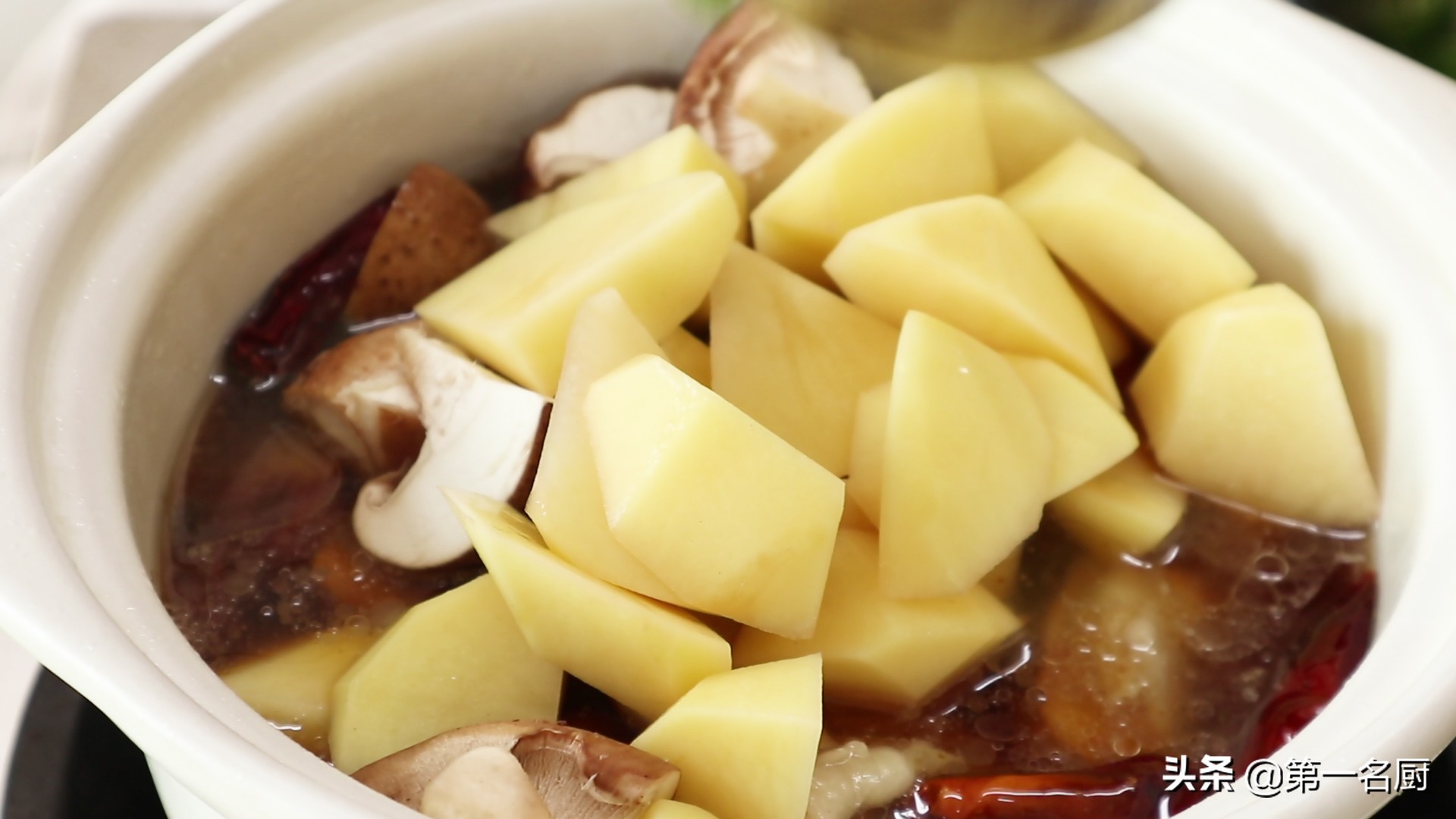 10.加入一碗清水,倒入香菇和土豆,盖上盖子,改中小火炖15分钟。