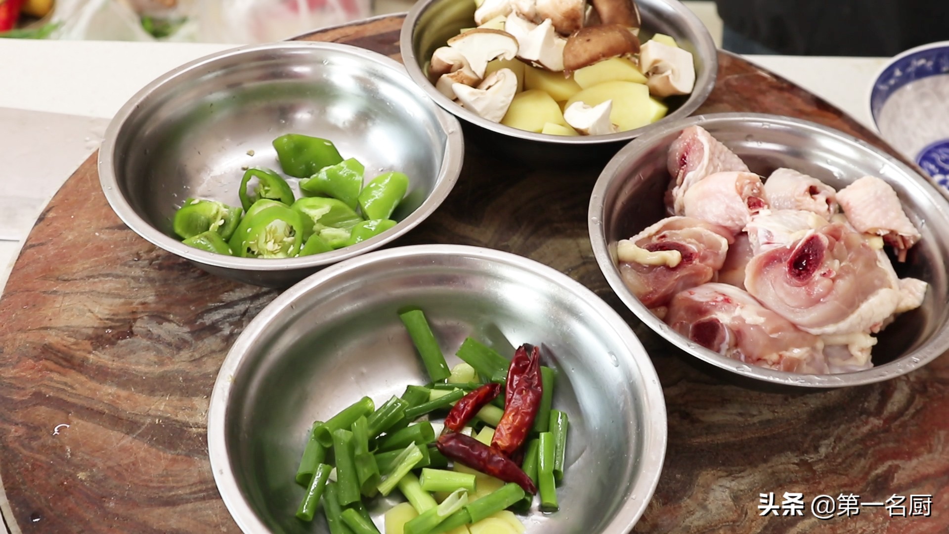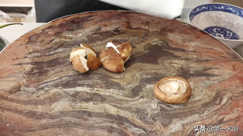 3.洗净的香菇三个,先去掉根部,一切四瓣,和土豆放在一起。