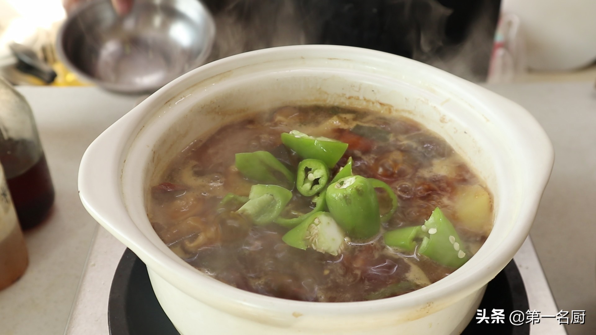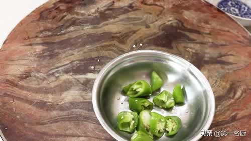 11.15分钟过后,打开锅盖,倒入切好的青椒,再炖一分钟,美味即成。